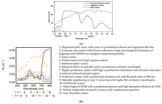 Reflectance curves: (a) clear water, green vegetation and dry bare soil by Lillesand and Kiefer []; and (b) optical water types by Spyrakos et al. [].