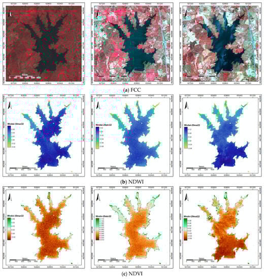 For the 16 dates, false-color compositions (FCCs) (Figure A1), spectral indices such as the normalized difference water index (NDWI) and normalized difference vegetation index (NDVI), as well as the spectral blue and green bands image ratio (B/G), were computed using imagery with a spatial resolution of 10 m (Table 3).