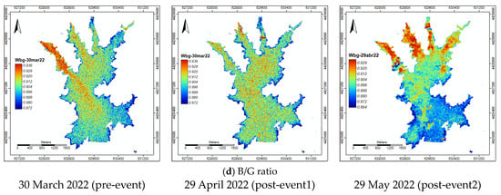 The FCC, NDWI, NDVI, and B/G ratio imagery (with a spatial resolution of 10 m) for the dates of 30 March 2022 (pre-event), 29 April 2022 (post-event 1), and 29 May 2022 (post-event 2) revealed certain patterns. In March, the land cover exhibited high humidity due to the significant precipitation that occurred during that month (Figure 2a and Figure 5a). An observed plume entering at point P5 was noticeable in both the DNWI and B/G ratio images (Figure 5b,d).