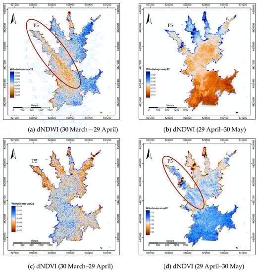 On the other hand, the dNDVI showed negative values between the pre-event and post-event 1 period (Figure 6c), suggesting a decrease in eutrophication, particularly at the east side of the reservoir and the water entry points. This decrease could be attributed to the high precipitation that occurred in March (Figure 2a). Between the post-event 1 and post-event 2 periods, positive values were observed in the dNDVI indicating an increase in eutrophication, primarily at the entry point P5 (Figure 6d—highlighted in red).