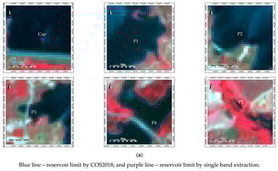 The spectral reflectance signatures in the monitoring points location (Figure 1b) were obtained with the sole purpose of exploring and validating the measurements in situ by APA. The multispectral imagery of 20 m spatial resolution, as nine bands were available (Table 1), provided a more complete spectral reflectance signature along the electromagnetic spectrum. Despite monitoring points sensors being in the water, mixed pixels of water and surrounding vegetation, bare soil, and infrastructures were observed in the 20 m spatial resolution imagery (e.g., Cap, P4, and P5) (Figure 7a). The spectral signatures obtained from the monitoring points locations on 30 March 2022 (pre-event), 29 April 2022 (post-event 1), and 29 May 2022 (post-event 2) demonstrated a general trend of increasing differentiation between the monitoring points locations (Figure 7b) as no precipitation occurred in April and May (Figure 2a). The effect of mixed pixels is more evident from Cap, P1, P2, P4, P3 to P5 monitoring point locations, with the latter showing a reflectance curve like the vegetation reflectance curve (see Figure 4a).