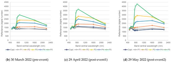 The nine spectral bands (e.g., B, G, R, R-edge 1, R-edge 2, R-edge 3, NIR narrow, SWIR 1, and SWIR 2) with a spatial resolution of 20 m were utilized to acquire the spectral signatures at the monitoring points for the following dates: 30 March 2022 (pre-event), 29 April 2022 (post-event 1), and 29 May 2022 (post-event 2).