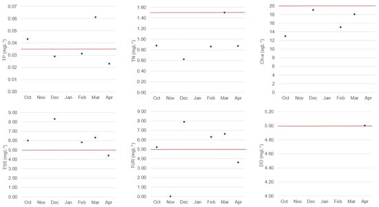 Study area—Marateca’s water quality parameters at the monitoring sampling point Capt from October 2021 to April 2022 and maximum admissible values (red line): TP—total phosphorus, TN—total nitrogen, Chl-a—chlorophyll, TSS—total suspended solids, TUR—turbidity, and DO—dissolved oxygen.