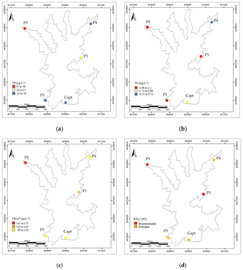 Values at monitoring points (Capt, P1, P3, P4 and P5) on 27 April 2022 (post-event) for: (a) TP—total phosphorus, (b) TN—total nitrogen, (c) Chl−a*—estimated chlorophyll-a, and (d) RTLI (TP)—reservoir trophic level index [].