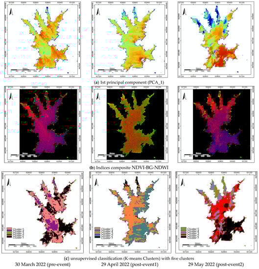 Study area—Marateca reservoir imagery (20 m spatial resolution) for the dates of 30 March 2022, 29 April 2022, and 29 May 2022: (a) 1st principal component (PCA_1); (b) indices composite NDVI-BG-NDWI; and (c) unsupervised classification (K-means Clusters) with five clusters.