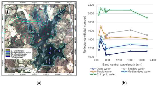 Study area—Marateca reservoir reflectance curves on 29 May 2022 imagery of 20 m spatial resolution: (a) training areas (polygons); and (b) reflectance curves for the considered five water classes (e.g., 1—deep water; 2—shallow water; 3—eutrophic water; 4—median deep water; and 5—turbid water).