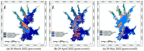 In addition, monthly difference indices, namely dNDWI and dNDVI, were computed to highlight the changes observed in the Marateca reservoir from October 2021 to January 2023, particularly focusing on the periods between 30 March 2022 (pre-event), 29 April 2022 (post-event 1), and 29 May 2022 (post-event 2).