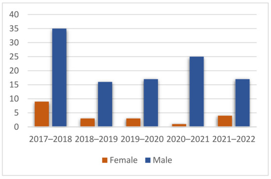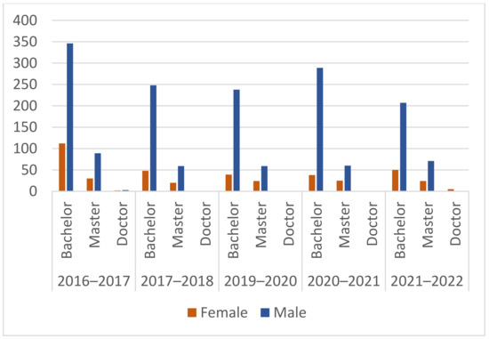 Gender ratio data are also available for different positions within the university’s human resources. Out of the staff members, 1014 are female, making up 66.14% of the workforce. The directorial board of MUST consists of 23 members, with four of them being female (17.4%). All 15 members of the representative board are male, while 49% of the department heads are female [7]. Overall, the gender ratio for leadership positions at MUST stands at 66.7% male and 33.3% female.