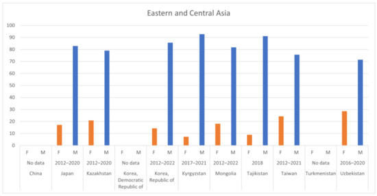 Employees of the mining and quarrying sector in countries across the Eastern and Central Asian regions, coloured by gender [female (F) = orange; male (M) = blue]. NB. where the percentages for a given country do not add to 100%, this indicates there were only data for male survey participants.