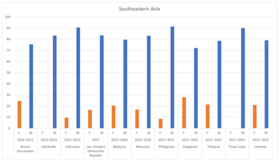 Employees of the mining and quarrying sector in countries across Southeastern Asia, coloured by gender [female (F) = orange; male (M) = blue]. NB. where the percentages for a given country do not add to 100%, this indicates there were only data for male survey participants.
