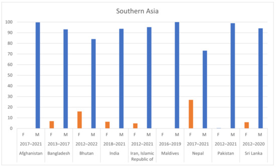 Employees of the mining and quarrying sector in Southern Asian countries, coloured by gender [female (F) = orange; male (M) = blue]. NB. where the percentages for a given country do not add to 100%, this indicates there were only data for male survey participants.