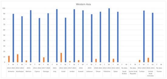 Employees of the mining and quarrying sector in Western Asian countries, coloured by gender [female (F) = orange; male (M) = blue]. NB. where the percentages for a given country do not add to 100%, this indicates there were only data for male survey participants. NB. where the percentages for a given country do not add to 100%, this indicates there were only data for male survey participants.