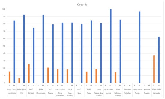 Employees of the mining and quarrying sector in countries across Oceania, coloured by gender [female (F) = orange; male (M) = blue]. NB. where the percentages for a given country do not add to 100%, this indicates there were only data for male survey participants.