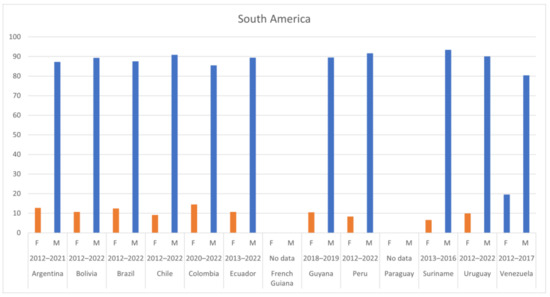 Employees of the mining and quarrying sector in South American countries, coloured by gender [female (F) = orange; male (M) = blue]. NB. where the percentages for a given country do not add to 100%, this indicates there were only data for male survey participants.