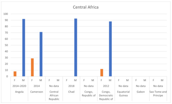 Employees of the mining and quarrying sector in Central African countries, coloured by gender [female (F) = orange; male (M) = blue]. NB. where the percentages for a given country do not add to 100%, this indicates there were only data for male survey participants.