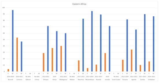 Employees of the mining and quarrying sector in Eastern African countries, coloured by gender [female (F) = orange; male (M) = blue]. NB. where the percentages for a given country do not add to 100%, this indicates there were only data for male survey participants.