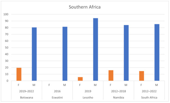 Employees of the mining and quarrying sector in Southern African countries, coloured by gender [female (F) = orange; male (M) = blue]. NB. where the percentages for a given country do not add to 100%, this indicates there were only data for male survey participants.
