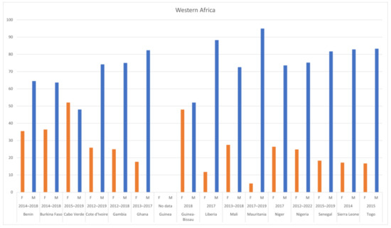 Employees of the mining and quarrying sector in Western African countries, coloured by gender [female (F) = orange; male (M) = blue]. NB. where the percentages for a given country do not add to 100%, this indicates there were only data for male survey participants.