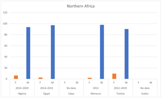 Employees of the mining and quarrying sector in Northern African countries, coloured by gender [female (F) = orange; male (M) = blue]. NB. where the percentages for a given country do not add to 100%, this indicates there were only data for male survey participants.