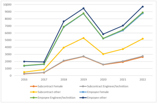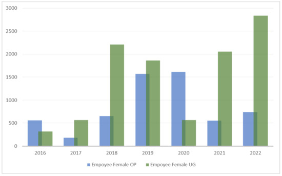 According to Figure 15, the number of female employees has experienced a significant increase over the past seven years, rising from 875 in 2016 to 3577 in 2022. It is noteworthy that many women are employed under contractual arrangements. The figure also illustrates the growth in female employees and subcontractors, from 253 in the past to the 2629 in 2022, with a temporary decrease observed in 2020 due to the impact of the COVID-19 pandemic. Additionally, the number of female employees in underground mines has reached 2840.
