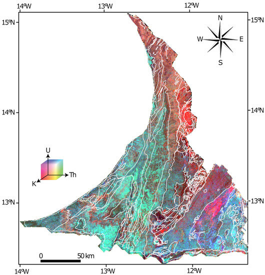- Fall, M.; Baratoux, D.; Ndiaye, P.M.; Jessell, M.; Baratoux, L. Multi-scale distribution of Potassium. Thorium and Uranium in Paleoproterozoic granites from eastern Senegal. J. Afr. Earth Sci. 2018, 148, 30–51. [Google Scholar] [CrossRef]