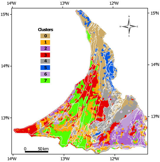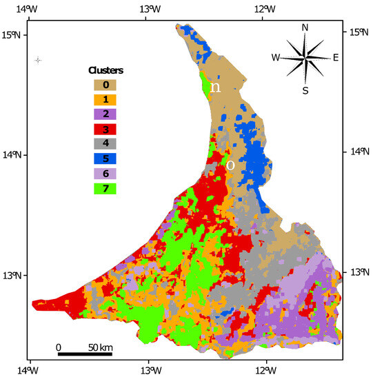 | Cluster 6 | Northern part of the Saraya granite | ![]() | ![]() | Active erosion area over granitoids rocks |