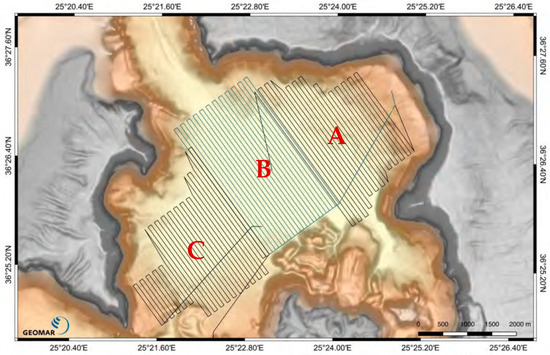Map of the area surveyed in the northern caldera of Santorini [26,38].
