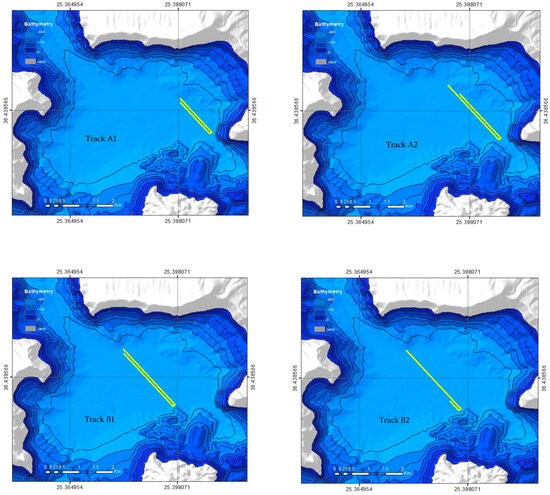 The exploration of the Santorini caldera spanned a duration of three days. The survey focused on the entire northern basin, and it included six tracks where the GMM was applicable (Tracks A1, A2, B1, B2, B3, C1). These tracks were considered the most reliable compared to the rest of the dataset since the vehicle remained very close to the seafloor for more than 30 min.