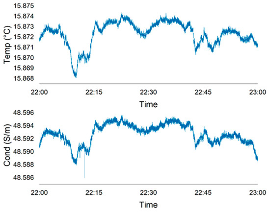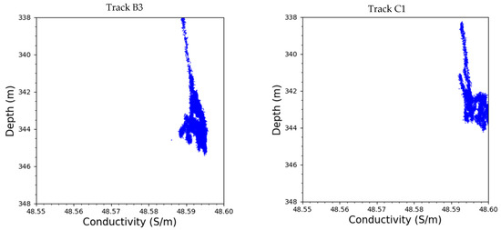 As for the time series, the behavior found in the graphs is consistent in both conductivity and temperature throughout all tracks, meaning that spikes appear at the same time in both parameters. However, the intensity of the spikes may differ. Figure 12 shows the time series for Track B3, while the time series for the rest of the tracks appear in Appendix B.