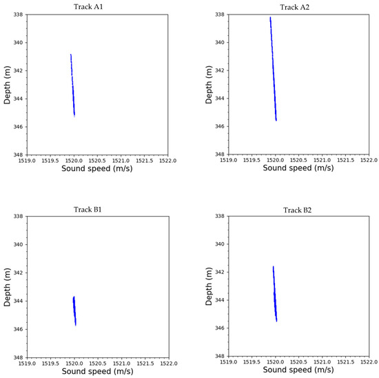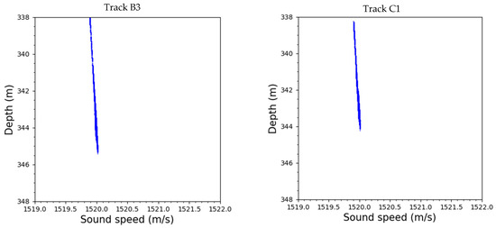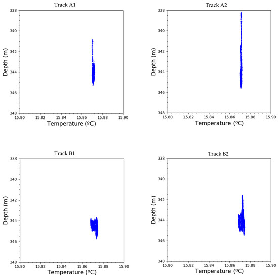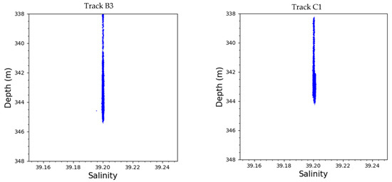 Images from the seafloor revealed a lack of significant fluid outflow from seabed edifices, bubble formation, and black smoke, compared to previous studies in Santorini’s neighboring submarine volcano, Kolumbo, where intense CTD anomalies were found [25]. Nevertheless, the mathematical model was applied to data recorded in separate locations within a period of half an hour or more. At first glance, anomalies were detected at a depth of 342–346 m in almost all vertical profiles (depth profiles) for both conductivity and temperature. Salinity and Sound Velocity, on the other hand, showed a straight line in all cases. Maps of the separate tracks are depicted in Figure 6, while all depth profiles appear in Figure 7, Figure 8, Figure 9 and Figure 10. On 27 March 2017, while the AUV was going through Area B, there was a track where the vehicle covered the shortest distance near the seafloor for an hour exactly (Track B3; 22:00–23:00; Figure 6). This track will be used in the next section to present the results of the GMM.
