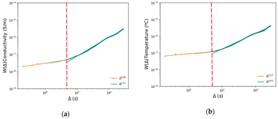 The distinct regimes in the plots are treated separately by fitting the variances of conductivity and temperature with a function of the form W = bΔγ. Figure 11 shows the variance for conductivity and temperature for Track B3. In the first regime for conductivity, for Δ < 5 s, a value of γ = 0.282 ± 0.013 is found, while in the second regime, γ = 1.115 ± 0.003. For temperature, for Δ < 1 s, we obtain a value of γ = 0.173 ± 0.010 in the first regime, whereas in the second γ = 0.931 ± 0.005. Table 2 compares these values of γ with those obtained from the rest of the tracks. Most of the exponents appear to have a value of , which means that the behavior is subdiffusive. The values marked with a red color, however, show a superdiffusive state, . More specifically, in the case of conductivity, we have a subdiffusive state in about half the tracks until Δ = 5 s. At the same time, in the second regime, the behavior is superdiffusive (Tracks B1, B2, B3, C1). In Area A, the behaviors appear to be subdiffusive before and after the turning point (Tracks A1, A2). On the other hand, temperature seems to have the same behavior as conductivity in the first regime (subdiffusive state until Δ = 5 s). In the second regime, however, the behavior is superdiffusive in Tracks B1 and B2, while most tracks reveal a subdiffusive behavior before and after the turning point (Tracks A1, A2, B3, C1).