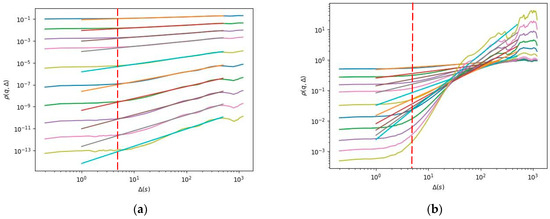 Both parameters show dependence on different lag times. A unique fit for each moment and all lag times captures the dynamics exclusively for large times. This can be interpreted by assuming that the respective dynamics for each regime are different. Data in the second regime have been fitted with Equation (4) for every moment. The convex shape of the structure functions implies that each time series corresponds to multifractal processes.