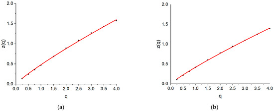 where defines the scaling of the mean-field of , and for , the field is conservative, , where measures the mean homogeneity of the field, and , where is the Lévy index, that is, the α–stable Lévy distribution from which the process draws its changes. The value of α shows how fast the inhomogeneity increases with the order of the moments. For , , and the distribution draws changes from a Cauchy–Lorentz distribution. For , Equation (5) reads , and the distribution draws changes from a lognormal distribution.