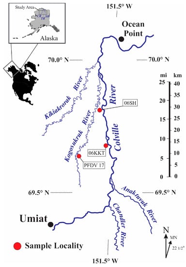 Samples from the Prince Creek Formation used in this study were previously collected from three field localities on the North Slope of Alaska. The Colville Basin of northern Alaska formed in the Aptian to Albian as a result of subsidence to the north of the Brooks Range orogenic belt [,]. Uplift and erosion of the Brooks Range drove clastic wedges, including the Prince Creek Formation, into the basin during the Late Cretaceous and Paleogene []. Bluffs of the Prince Creek Formation along the Colville, Kogosukruk, and Kikiakrorak rivers dip to the northeast (<3°), exposing alluvial sandstone, siltstone, shale, coal and bentonites [,]. The entire Prince Creek Formation is known to range in age from Campanian to Paleocene; however, the samples used in this study are thought to be early Maastrichtian, based on palynological and geochronological constraints []. Plate reconstructions indicate that the Prince Creek Formation was deposited at a paleolatitude of 82–85 °N [,].