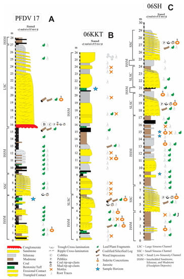 Measured stratigraphy including all stratigraphic features and sample horizons from the Prince Creek Formation in northern Alaska. Figure includes the stratigraphic location of samples analyzed for this study, indicated by blue stars. (A) Representative stratigraphic column and paleoenvironmental interpretations for the PFDV 17 sample locality along the Kogosukruk River. (B) Representative stratigraphic column and paleoenvironmental interpretations for the 06KKT sample locality along the Colville River. (C) Representative stratigraphic column and paleoenvironmental interpretations for the 06SH sample locality along the Colville River.