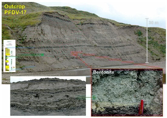 Outcrop imagery of locality PFDV 17 located along the Kogosukruk River showing the sedimentologic, stratigraphic and stratal architecture framework of the site. Figure includes part of the PFDV 17 stratigraphic chart. Outlined red box and green arrow show the location of the sampled bentonite layer along the outcrop belt and a closeup image of the bentonite. Pocketknife is 9 cm for scale.