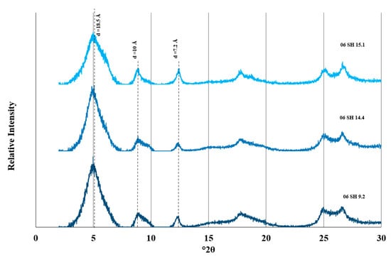 X-ray diffraction analyses of the <0.2 µm-size fraction from paleosol samples collected from locality 06SH revealed a mixture of smectite (001) peak (18.5 Å), illite/mica (001) peak (10 Å), and kaolinite (001) peak (7.2 Å) (Figure 4, Table 1). The average kaolinite content of the three paleosol samples was ~21%, with the remainder accounted for by 2:1 phyllosilicates. The chemical composition of end-member 2:1 phyllosilicates was calculated using wt% oxide data collected from the <0.2 µm-size fraction (Table 1). The wt% kaolinite of each sample was taken into account based on results from X-ray diffraction spectra. The mole fraction of Al2O3 and SiO2 within mineralogical mixtures of each sample was calculated from the wt% oxide data in Table 1. Estimated mole fractions of Al and Si from kaolinite were subtracted from the phyllosilicate mixtures to calculate an end-member 2:1 phyllosilicate chemical formula for each sample. X-ray diffraction analyses of the <2 µm-size fraction of the bentonite samples 06KKT-20.5 and PFDV 17 confirmed the results of Salazar-Jaramillo et al. [], revealing a monomineralic signature (pure montmorillonite; Supplementary Table S1).