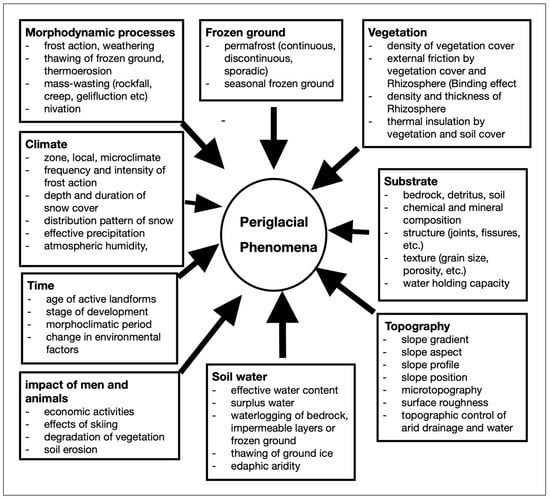 The original term ‘periglacial’, introduced by von Lozinski in 1909 (see [2]), means ‘around glacial’ and, thus, focuses on location. An entire research field of periglacial geomorphology particularly developed since the mid-1940s with a focus on Central Europe, and the first specialized book The Periglacial Environment was published by French (1976) [3] in the 1970s. A wide range of elements defined the periglacial environment, for example, cold climate, topography, frozen ground, morphodynamic processes, soil water, and human impacts.