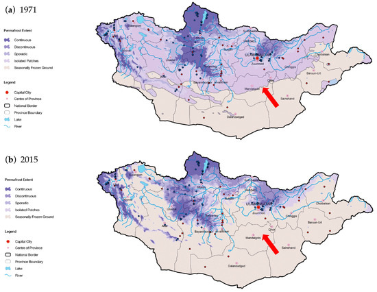 The recession of the southern permafrost boundary in Mongolia between 1971 and the 2010s has been interpreted as an impact of climate change. Digitized versions of the maps by (a) Gravis et al. (1971) [22] and (b) Jambaljav et al. (2016) [29] in Evans et al. (2018) [40]. The isolated patches class in (a) is, in fact, the island class in the original ‘Gravis Map’. The red arrow points at the southern boundary of the permafrost region in 1971. The dots are the permafrost borehole monitoring sites form Jambaljav et al. (2016): blue = permafrost, red = no permafrost.