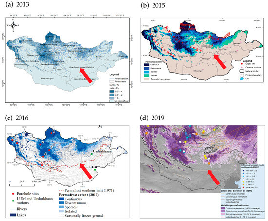Permafrost maps for Mongolia from different authors. Part 2: maps that display the permafrost region for the 2010s, when less than 50% of the country’s territory (see permafrost-free area highlighted by red arrow and Figure 5 for comparison). (a) Zorigt et al. (2020) [38]; (b) Jambaljav et al. (2016) [29]; (c) Saruulzaya et al. (2021) [35]; (d) clip from the map by Obu et al. (2019) [11]. Map (a) includes three permafrost zones, while (b–d) include four. The red arrows points at the southern boundary of the permafrost region in 1971.