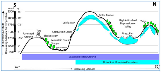 Today, it is understood that periglacial is location-independent and rather focuses on process: frost action and/or permafrost-related processes are dominant and represent, besides glacial processes, the most influential factors shaping landscapes in cold polar zones and high mountains [4,5,6,7]. One conventional description is that periglacial environments include those in which frost action governs at a mean annual air temperature (MAAT) of below −2 °C, or those in which permafrost-related processes dominate at a MAAT of between −2 °C and +3 °C [6,8]. In areas of intensive frost activity and cryogenic weathering, processes such as heaving and sorting are common resulting in the formation of various types of patterned ground. Slow mass movements such as solifluction and gelifluction [9] rule, but also other geomorphological processes such as fluvial ones are involved in shaping the periglacial environment [10] (Figure 1). While these characteristics describe the periglacial environment, they do not necessarily define permafrost. In many permafrost maps of Mongolia, ‘seasonal frozen ground’ is included as a separate zone, which might lead to misinterpretations and an overestimation of the total permafrost coverage as seasonal frozen ground is part of the periglacial but not the permafrost environment.