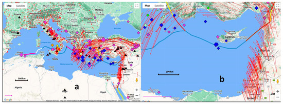 From UNAVCO. GPS velocity (red arrows) vector plate boundary (colored thick lines), volcanoes (black triangles), earthquakes (colored polygons). (a) the Mediterranean map, (b) a detailed view of Cyprus. For a precise legend, see: https://www.unavco.org/software/visualization/GPS-Velocity-Viewer/GPS-Velocity-Viewer.html. Accessed on 15 June 2023.