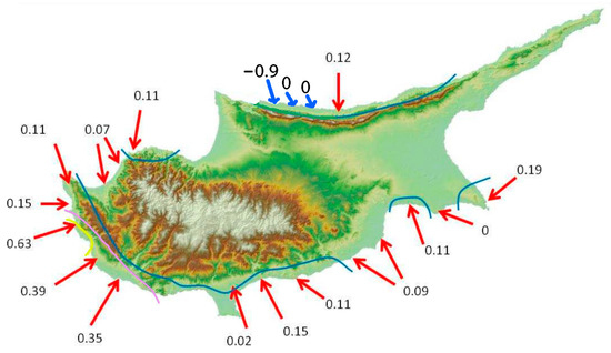 Vertical tectonics rates on the coast of Cyprus from the Last Interglacial (118 kyr). Rates marked with a red arrow are from [11] while those marked with a blue arrow are from [1]. All rates are in units of mm/yr. The blue, purple, and yellow lines mark the 0.1, 0.2, and 0.4 mm/year uplift isolines, respectively. From [11].