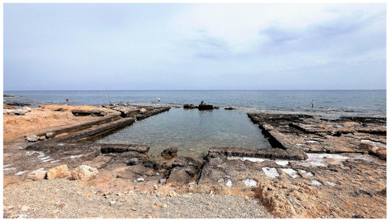 The aim of this research is to evaluate the relative sea-level changes at the site of the Lambousa fishtank (ft), first reported by Galili et al. [1] on the northern coast of Cyprus, at the time slice between today and 2 ka BP. The authors did not evaluate sea level changes, while here we use it, just as a very precise sea level marker, as suggested by [2]. Roman fts were built mainly along the Mediterranean coast [3,4,5,6,7,8], and they followed precise construction rules. The architectural elements of the Mediterranean fts are: the channels, the sluicegates, and the foot walk, also named Crepido, which, if well-preserved, bears directly on mean sea level at the time of construction and provides a precise measurement of the relative sea level change from the time of construction. Mediterranean fts were built in a short time interval between 2.1 and 1.9 ka BP [5]. The archaeological interpretation must initially establish the maritime and/or nature and vocation of the site (harbor, fishtanks, etc.), determine its typology and specific usage, analyze the elements of its building techniques (that reveal themselves as meaningful markers of height or depth at the time of building) and its functional elements, such as the height of the emerged part with respect to the mean sea level, and point out the time of construction and its chronological range of usage and frequentation. The evaluation of both the height and functional depth to the mean sea level depends on the typology of the archaeological evidence, its use, and the local tide amplitudes [2]. For example, the surface of a pier surely has a functional elevation different from that of a haulage area, a quarry, or a pavement. The functional height of a pier and its relationship with the current and past sea level depends on the size and height of the hull of the ship using the dock. The functional height of a ft, if measured at Crepido connected with a sluicegate, is assumed to be zero. The palaeo sea level of a ft is instead the measure between Crepido and the present sea level and must be corrected for the local tide and pressure [2,5].
