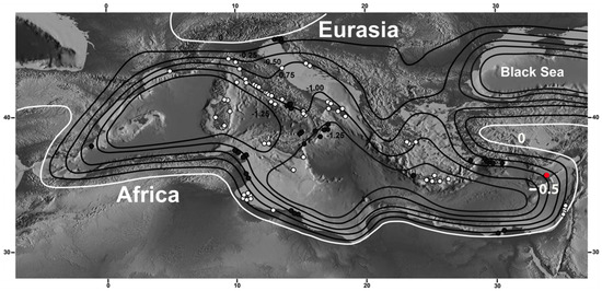 Estimated relative sea levels and shorelines across the Mediterranean at 2 ka BP (modified from [16]). The contour interval is 0.25 m. Black contours are negative values and white contour is zero change. The red dot represents the position of the Lambousa ft pool, between −0.50 and −0.75 m, but closer to −0.50 m.