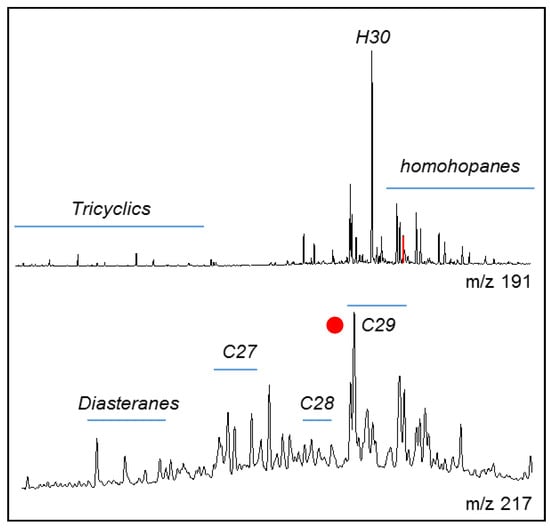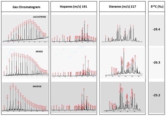 Group A is characterized by high values of HOP/STER, TPP/(TPP + diasterane), significant presence of methylsteranes, low values of GAM/H30, tricyclic/hopanes (TRIC/HOP), and diasterane/C27αα, associated with δ13C values < −28.15‰ (Figure 4). Many authors have interpreted these features as indications of freshwater lacustrine sources [,,].