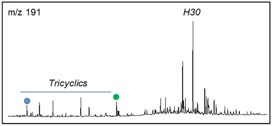 Terpanes’ distribution of the sample presents no correlation with other oils. Blue dot: C19 tricyclic; green dot: C24 tetracyclic).