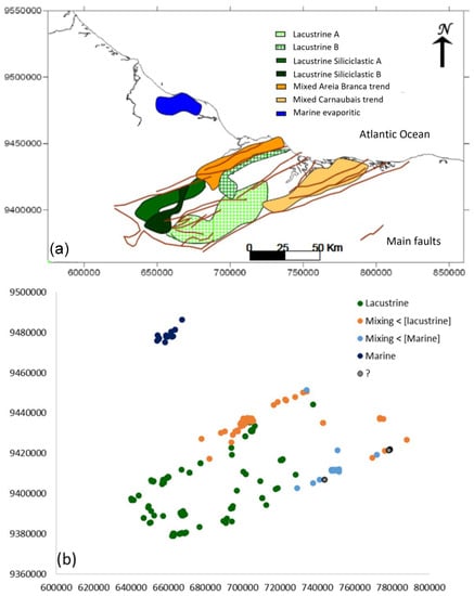 The similarities and differences between marine evaporitic and lacustrine samples are clear, and this is even more evident when we analyze the PCC results between these two systems (Table 2). The results from mixed oils presented an interesting variability, probably caused by the classification subjectivity. In other words, if the sample contains a bigger contribution from the marine evaporitic system (>50%), the result becomes closer to a “pure marine evaporitic sample”, and the same logic goes for the lacustrine system contribution (see Supplementary Data: File S1). It is important to highlight that the proposed method was not able to distinguish the four types of lacustrine oil samples (A, B, Siliciclastic A, and Siliciclastic B) classified by Morais [], so all of them are classified as lacustrine.