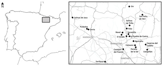 Geographical position of the saltworks of the Huesca province (Spain). In some cases, villages, such as Peralta de la Sal, take their name from the presence of the saltworks.