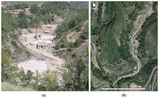 The Iruelas saltworks are in the Guibano ravine bed. They were discontinued some time ago due to their low economic productivity. However, most of the buildings and the ponds are still in reasonably good condition (Figure 2a,b). They can be accessed by a road that originates from Naval, leading from El Grado to Abizanda.